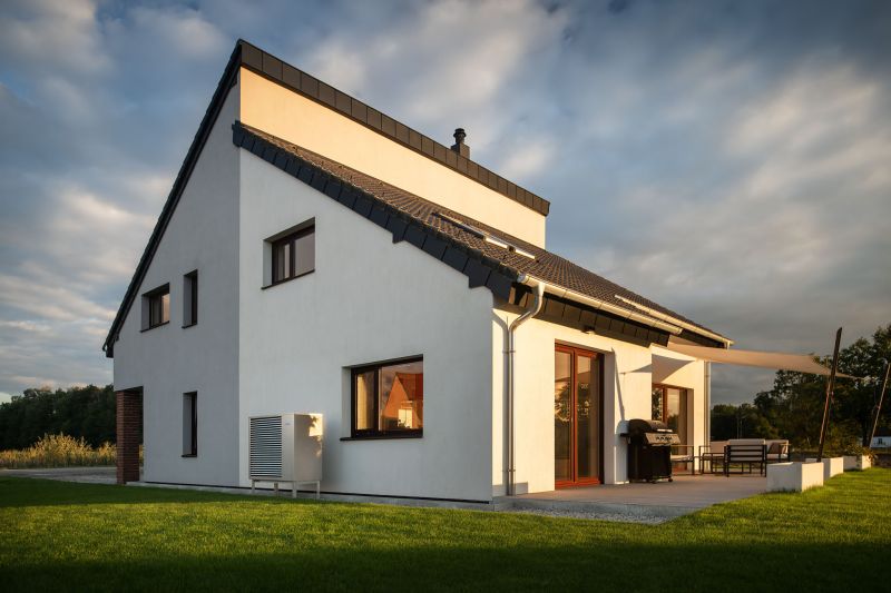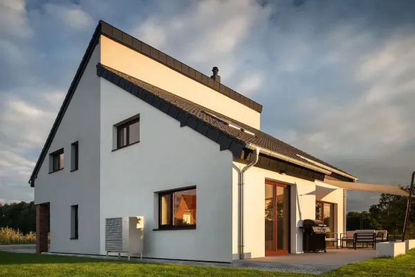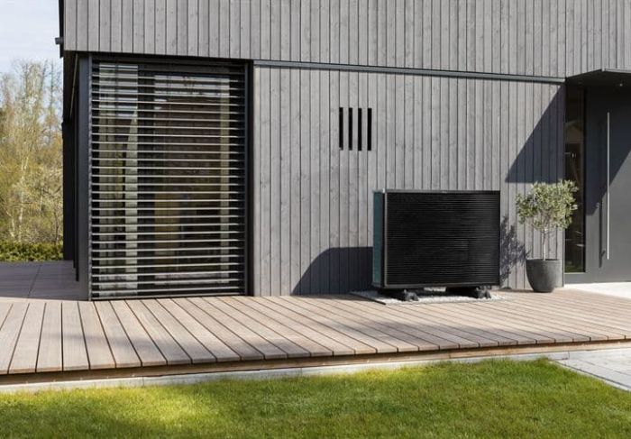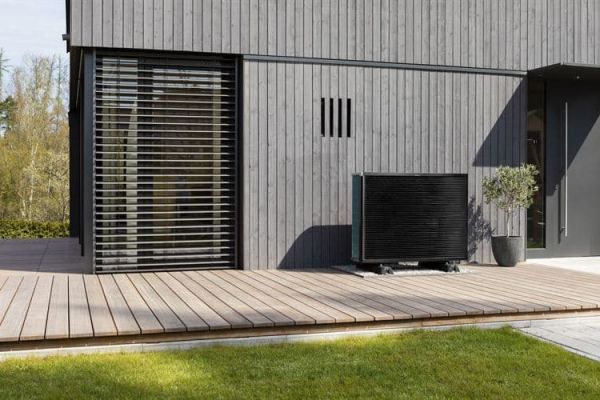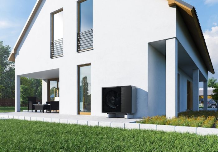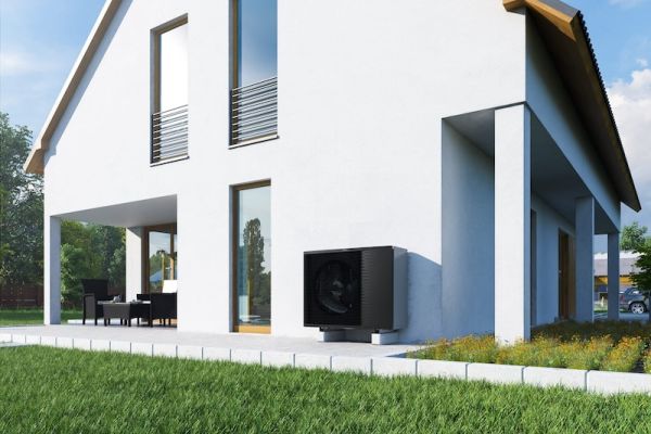 Pohled na naleštěné, plně funkční tepelné čerpadlo před stěnou domu.